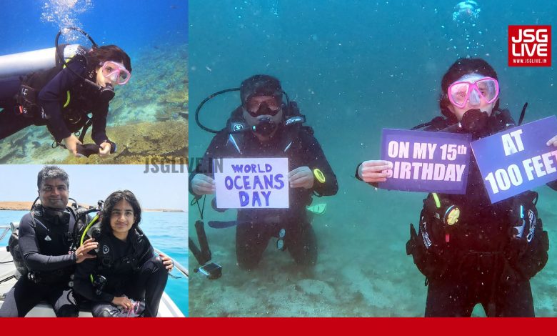 During the dive, Tisya held placards reading “On my 15th birthday” and “At 100 feet”, while her father held one that read “World Oceans Day” — making the moment deeply symbolic and emotionally powerful.