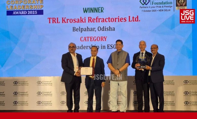 Jharsuguda: TRL Krosaki has received the prestigious Greentech Corporate Leadership Award 2025 for its leadership in Environmental, Social, and Governance (ESG). The award function was organised by Greentech Foundation at Hotel Redission Blue Plaza, New Delhi. The award was received by Niranjan Dash, Vice President (Safety & Sustainability), and Dr. Arup Kumar Samanta, Vice President (Technology), TRL Krosaki, from Major General (Retd.) Sanjay Meston. Eminent dignitaries like Dr. R. K. Dubey, Ex CMD of Canara Bank, and Kamlesh Saran, Chairman, Greentech Foundation, were present on the dais during the award function.