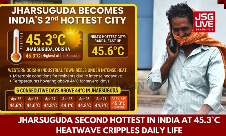 Jharsuguda, April 28: Western Odisha’s industrial town Jharsuguda continued to reel under an intense heatwave, emerging as the second hottest city in the country on Monday with a scorching 45.3°C, just behind Banda, which recorded 45.6°C.